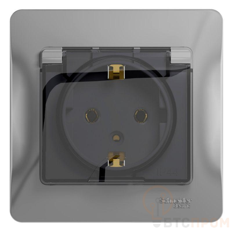 Розетка Systeme Electric (ранее Schneider Electric) серии Glossa (в сборе, цвет алюминий) одинарная с заземлением, шторками и крышкой подходит для сетей 250 В, на ток 16 А. - Заземляющий контакт обеспечивает дополнительную защиту от удара электрическим током. При наличии заземления электрический потенциал уходит в землю, защищая человека. - Выполнен из материала PС+ASA, стойкого к УФ-излучению и появлению царапин. - Эргономичные клеммы розеток расположены в один ряд.