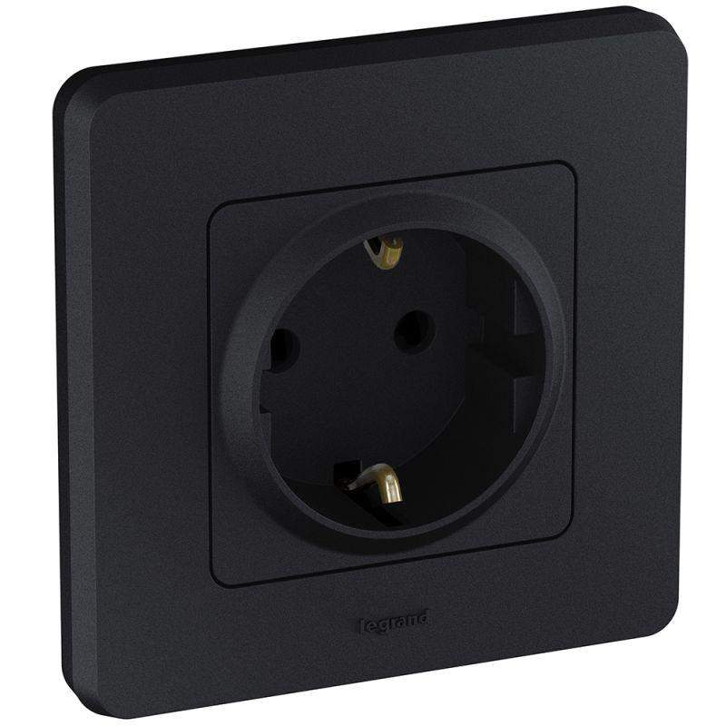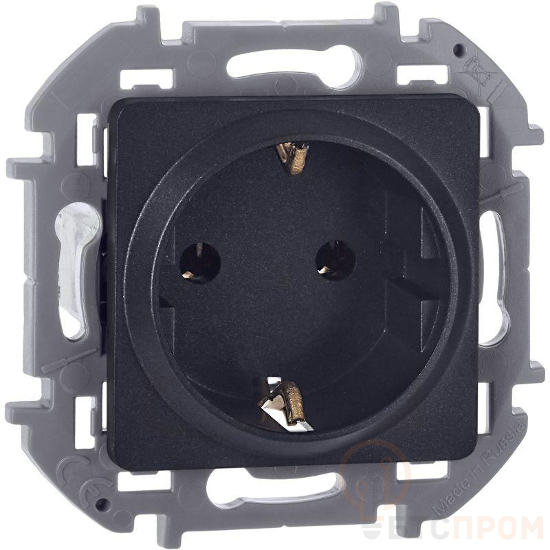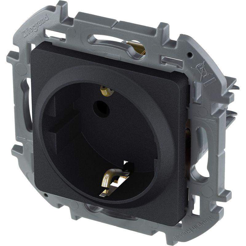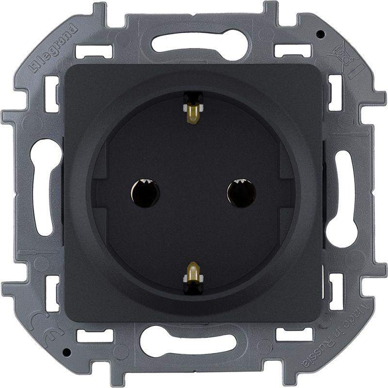 Розетка с заземлением для скрытого монтажа Inspiria, цвет "Антрацит", максимальный ток 16А, напряжение ~250В, максимальная мощность 3680Вт, винтовые зажимы. Применяется для присоединения однофазных электрических потребителей к сети переменного тока в зданиях с проводкой с заземлением (с защитным проводником).