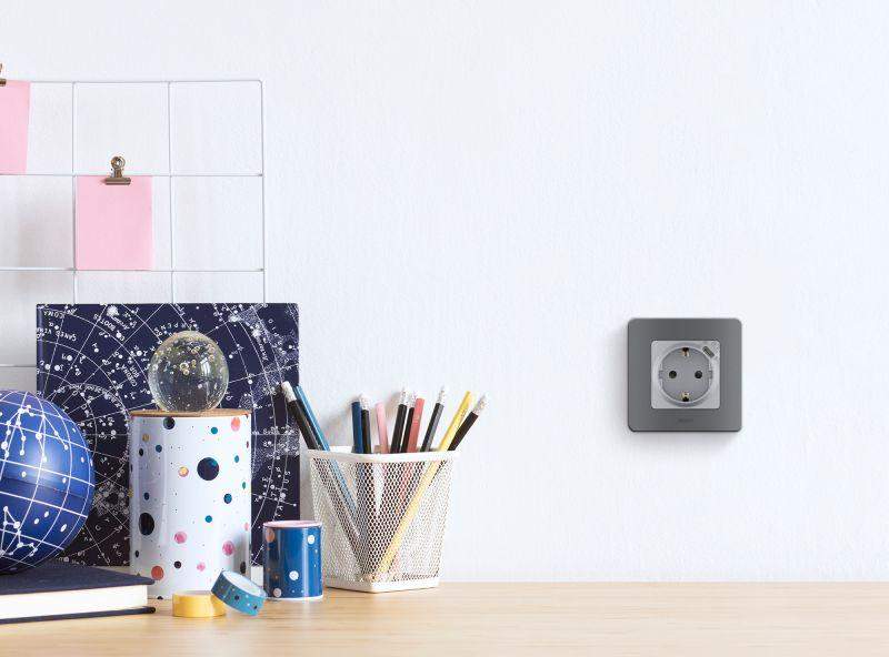 Комбинированная розетка 2К+З с зарядным устройством USB тип С Inspiria для скрытого монтажа, цвет "Алюминий". Максимальный ток розетки 16АХ, напряжение розетки ~250В, напряжение зарядного устройства =5В, максимальный зарядный ток 1500 мА. Применяется для одновременного электропитания бытовых потребителей и зарядки мобильного устройства. Оснащена интегрированными шторками, которые защищают детей и других пользователей от удара электрическим током.