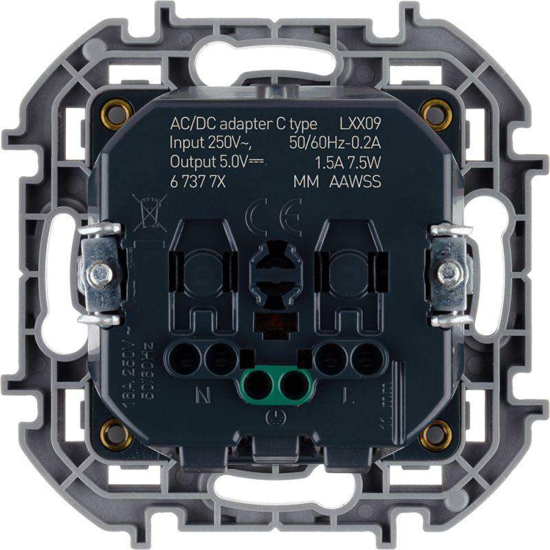 Комбинированная розетка 2К+З с зарядным устройством USB тип С Inspiria для скрытого монтажа, цвет "Антрацит". Максимальный ток розетки 16АХ, напряжение розетки ~250В, напряжение зарядного устройства =5В, максимальный зарядный ток 1500 мА. Применяется для одновременного электропитания бытовых потребителей и зарядки мобильного устройства. Оснащена интегрированными шторками, которые защищают детей и других пользователей от удара электрическим током.