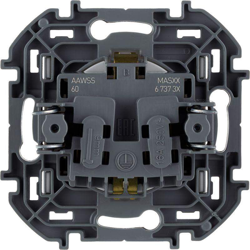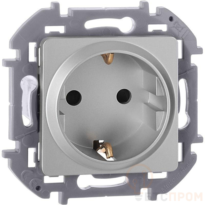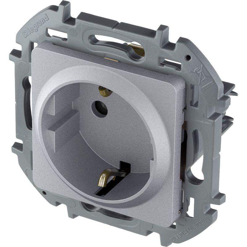 Розетка с заземлением, с защитными шторками для скрытого монтажа Inspiria, цвет "Алюминий", максимальный ток 16А, напряжение ~250В, максимальная мощность 3680Вт, винтовые зажимы. Применяется для присоединения однофазных электрических потребителей к сети переменного тока в зданиях с проводкой с заземлением (с защитным проводником).