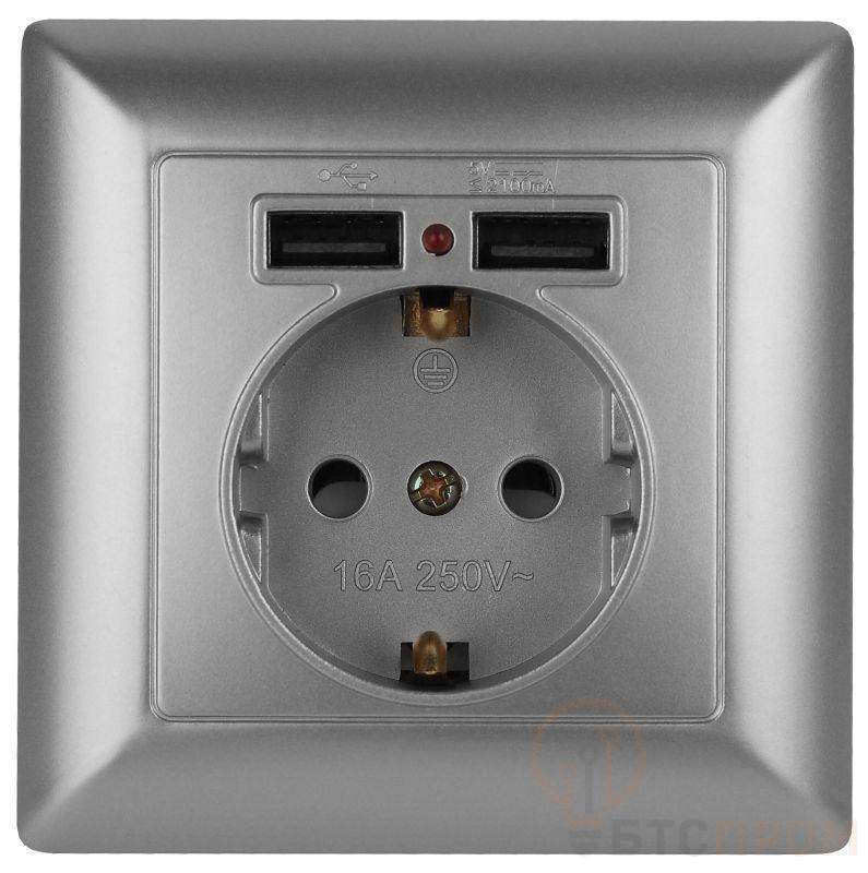 Розетка 1-м СП Solo 4-410-03 P+E Schuko 16А 250В + 2хUSB IP20 с заземл. защ. шторки алюм. Intro Б0053715