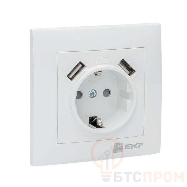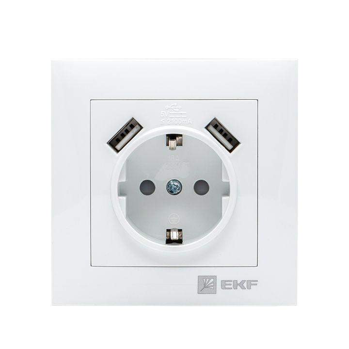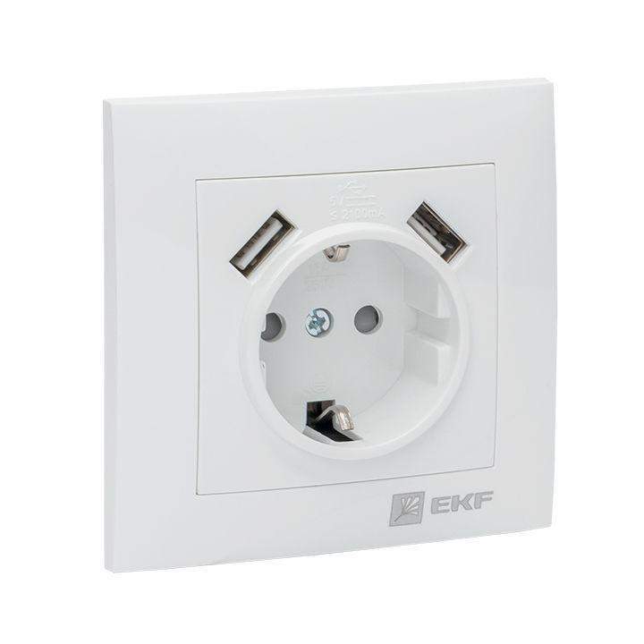 Розетка 1-м СП Валенсия 16А IP20 с заземл. защ. шторки с 2-мя заряд. устройствами USB 2.1А бел. PROxima EKF EWR16-028-10-2USB