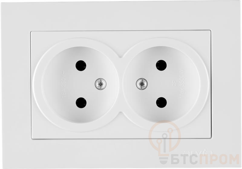 Модель выполнена в классическом белом цвете и представляет собой сдвоенную розетку (2 места) без заземляющего контакта. Корпус изготовлен из прочного не поддерживающего горение пластика, что гарантирует безопасность и долговечность эксплуатации.