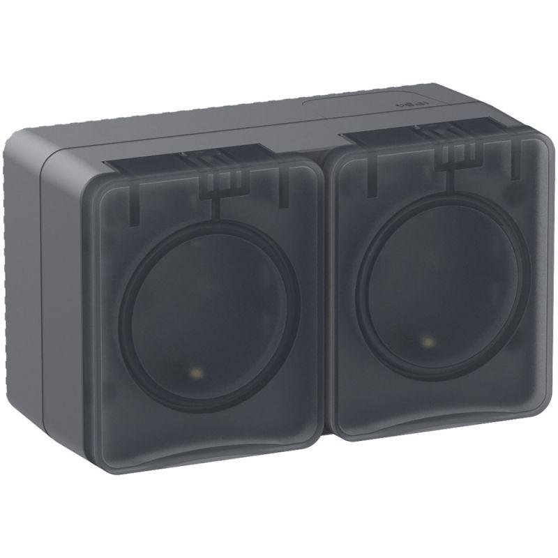 Розетка двойная с заземлением со шторками для открытого монтажа, 16А, 250В. Степень защиты IP:54, Степень защиты IK: IK08. Продукция AtlasDesign Profi54 созданы специально для тех мест, где требуется повышенная защита от влаги и пыли. Уютная веранда в загородном доме, уличное кафе, любимый гараж или мастерская – выключатели и розетки будут обеспечивать надежную защиту и радовать глаз современным дизайном. Элегантный цвет антрацит гармонично впишется в любую обстановку.