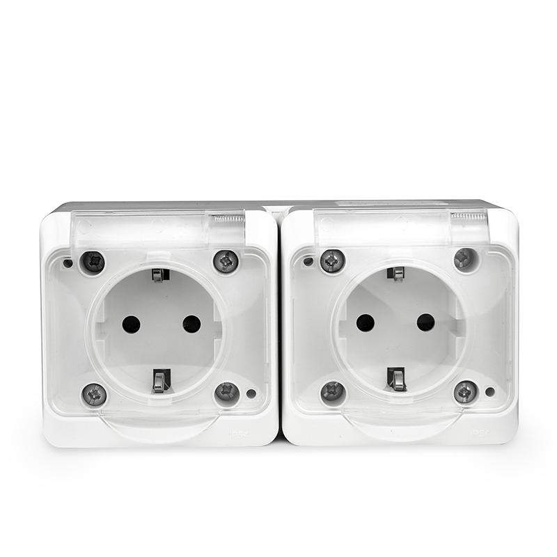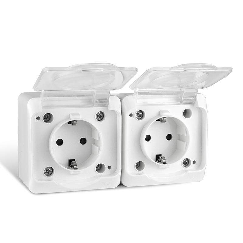 Ключевой особенностью является высокая степень защиты IP54, которая обеспечивает эффективную защиту от брызг воды и пыли, что делает устройство идеальным для монтажа в ванных комнатах, на кухнях, балконах, в гаражах, мастерских, а также для уличного использования. Прозрачная ударопрочная крышка позволяет визуально контролировать процесс подключения вилки, не открывая розетку, и сохраняет эстетичный внешний вид. Корпус выполнен в классическом белом цвете.