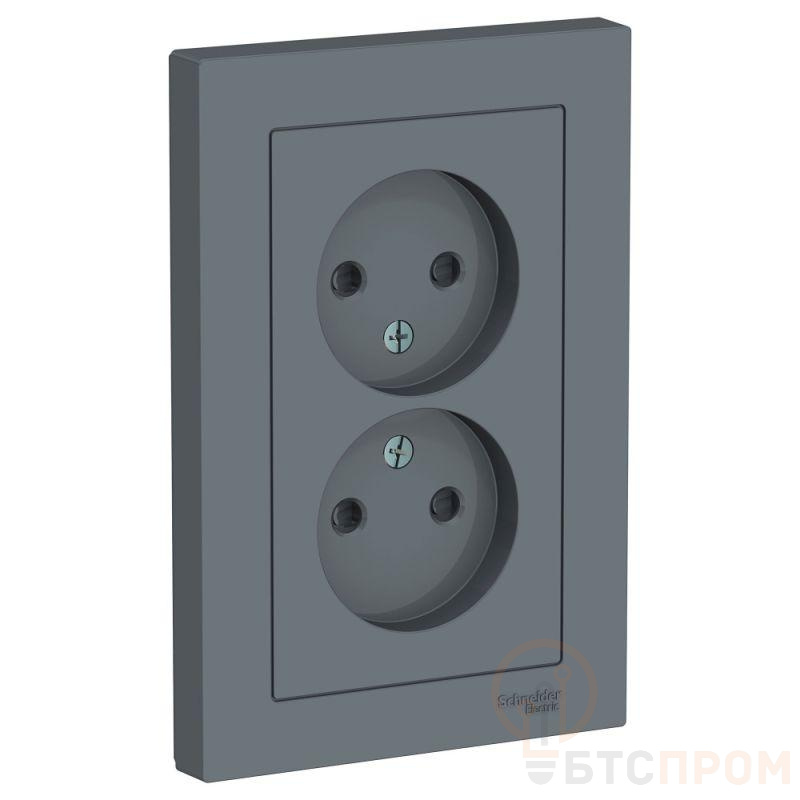 Розетка двойная Systeme Electric (ранее Schneider Electric) серии AtlasDesign (в сборе, цвет грифель) без заземления со шторками подходит для сетей 250 В, на ток 16 А. - Лицевые детали из качественного ABS-пластика, устойчивого к царапинам и УФ-излучению. - Двойная розетка позволяет подключить два устройства в одном месте. - Изделие поставляется в комплекте с рамкой того же цвета. - Усиленные прямые монтажные лапки для лучшей фиксации механизма в монтажной коробке.