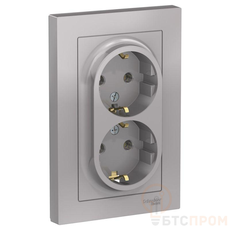 Розетка двойная Systeme Electric (ранее Schneider Electric) серии AtlasDesign (в сборе, цвет алюминий) с заземлением, без шторок подходит для сетей 250 В, на ток 16 А. - Заземляющий контакт обеспечивает дополнительную защиту от удара электрическим током. - Лицевые детали из качественного ABS-пластика, устойчивого к царапинам и УФ-излучению. - Двойная розетка позволяет подключить два устройства в одном месте. - Изделие поставляется в комплекте с рамкой того же цвета.