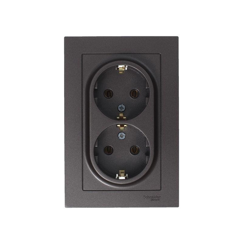 Розетка двойная Systeme Electric (ранее Schneider Electric) серии AtlasDesign (в сборе, цвет мокко) с заземлением, без шторок подходит для сетей 250 В, на ток 16 А. - Заземляющий контакт обеспечивает дополнительную защиту от удара электрическим током. - Лицевые детали из качественного ABS-пластика, устойчивого к царапинам и УФ-излучению. - Двойная розетка позволяет подключить два устройства в одном месте. - Изделие поставляется в комплекте с рамкой того же цвета.