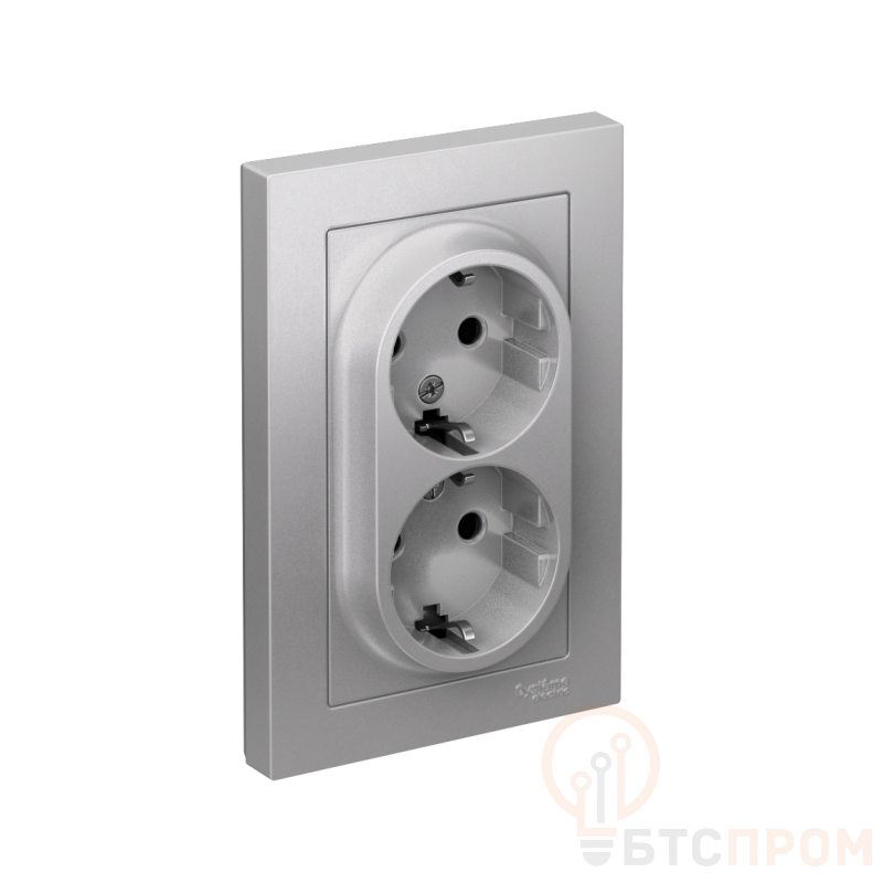 Розетка двойная Systeme Electric (ранее Schneider Electric) серии AtlasDesign (в сборе, цвет алюминий) с заземлением и шторками подходит для сетей 250 В, на ток 16 А. - Заземляющий контакт обеспечивает дополнительную защиту от удара электрическим током. - Лицевые детали из качественного ABS-пластика, устойчивого к царапинам и УФ-излучению. - Двойная розетка позволяет подключить два устройства в одном месте. - Изделие поставляется в комплекте с рамкой того же цвета.