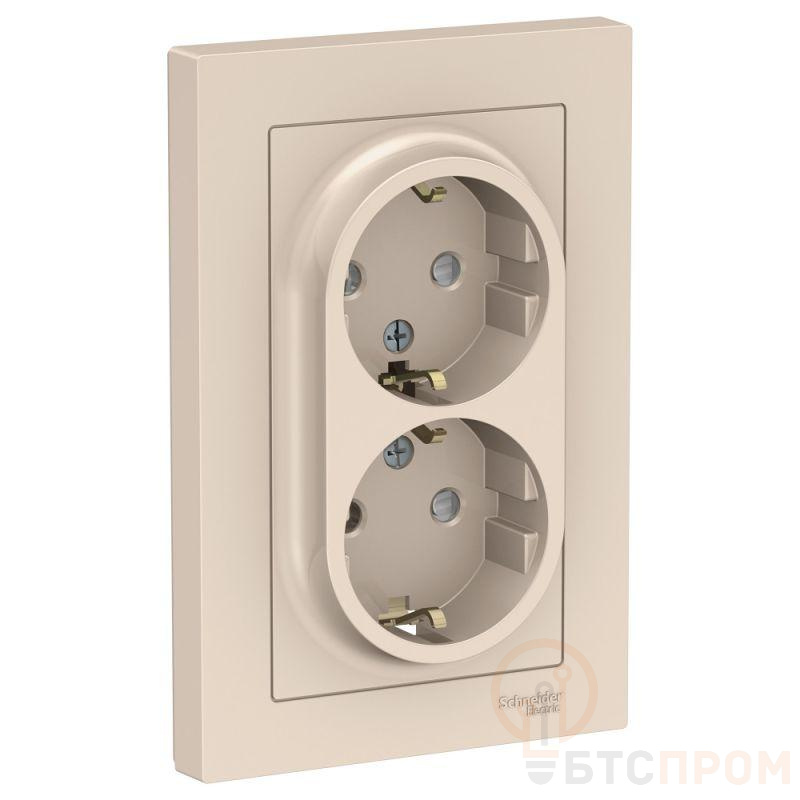 Розетка двойная Systeme Electric (ранее Schneider Electric) серии AtlasDesign (в сборе, цвет бежевый) с заземлением и шторками подходит для сетей 250 В, на ток 16 А. - Заземляющий контакт обеспечивает дополнительную защиту от удара электрическим током. - Лицевые детали из качественного ABS-пластика, устойчивого к царапинам и УФ-излучению. - Двойная розетка позволяет подключить два устройства в одном месте. - Изделие поставляется в комплекте с рамкой того же цвета.