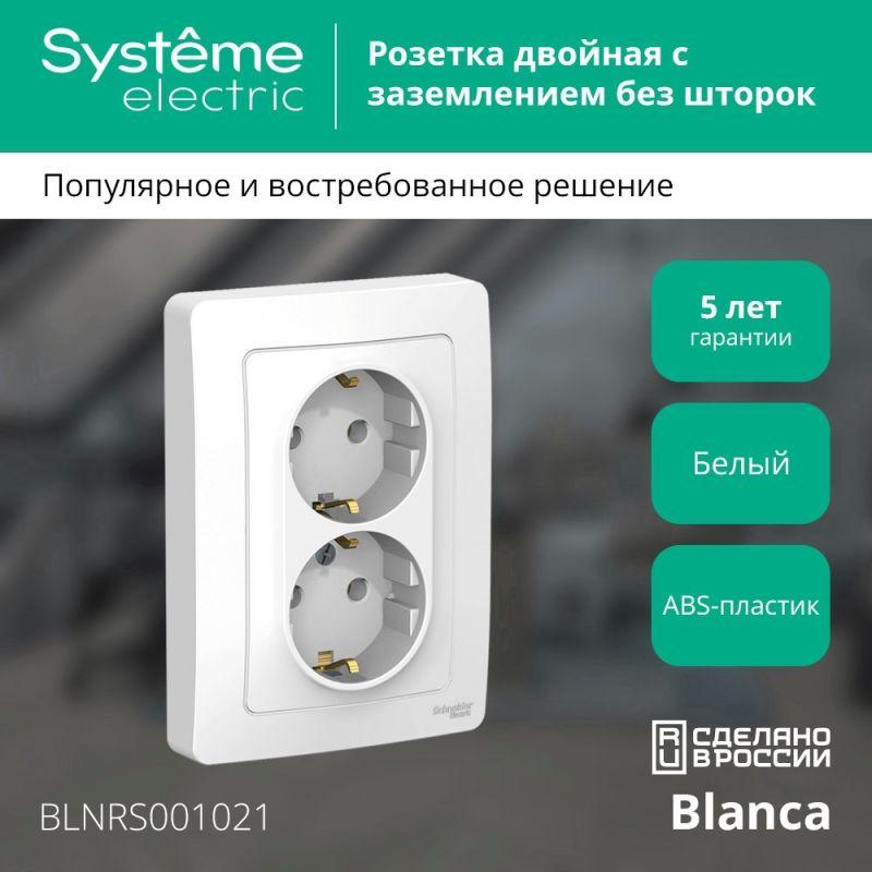Розетка Systeme Electric (ранее Schneider Electric) BLANCA (белый, скрытой установки) двухместная, с заземлением, без шторок предназначена для сетей до 250В, на ток до 16А. Двухместная розетка позволяет подключить два устройства в одном месте. Заземление обеспечивает безопасность при косвенном прикосновении. Она изготовлена из ABS-пластика, проста в установке и удобна в применении.