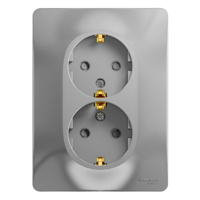 Розетка двойная Systeme Electric (ранее Schneider Electric) серии Glossa (в сборе, цвет алюминий) с заземлением и шторками подходит для сетей 250 В, на ток 16 А. - Заземляющий контакт обеспечивает дополнительную защиту от удара электрическим током. При наличии заземления электрический потенциал уходит в землю, защищая человека. - Выполнен из материала PС+ASA, стойкого к УФ-излучению и появлению царапин. - Двойная розетка позволяет подключить два устройства в одном месте.