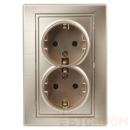 Розетка двойная 2-я серии Intro Plano скрытой установки цвет шампань 1-205-04. Номинальные характеристики 16А 250В. Розетка выполнена из керамики, укомплектована одноместной рамкой, оснащена винтовыми клеммами. Клеммы с двумя отверстиями позволяют соединять соседние розетки шлейфом. Установка в подрозетник производится как на монтажные лапки, так и на винты.