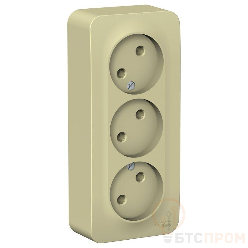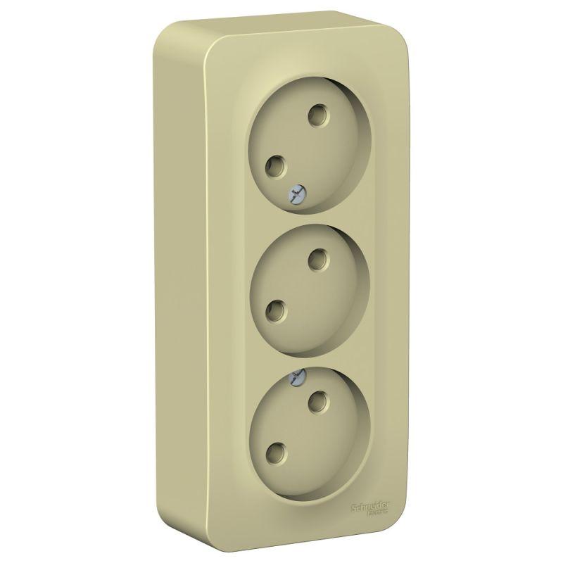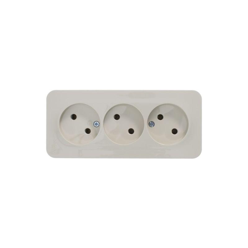 Розетка Systeme Electric (ранее Schneider Electric) BLANCA (открытой установки, цвет бежевый) трёхместная без заземления и шторок, с изолирующей пластиной подходит для сетей 250 В, на ток 16 А. -Корпус изделия выполнен из ABS-пластика. - Входные отверстия расположены под углом 45 градусов, благодаря чему можно подключить несколько устройств: вилки и адаптеры не будут мешать друг другу. - Четкая маркировка клемм для безошибочного подключения.