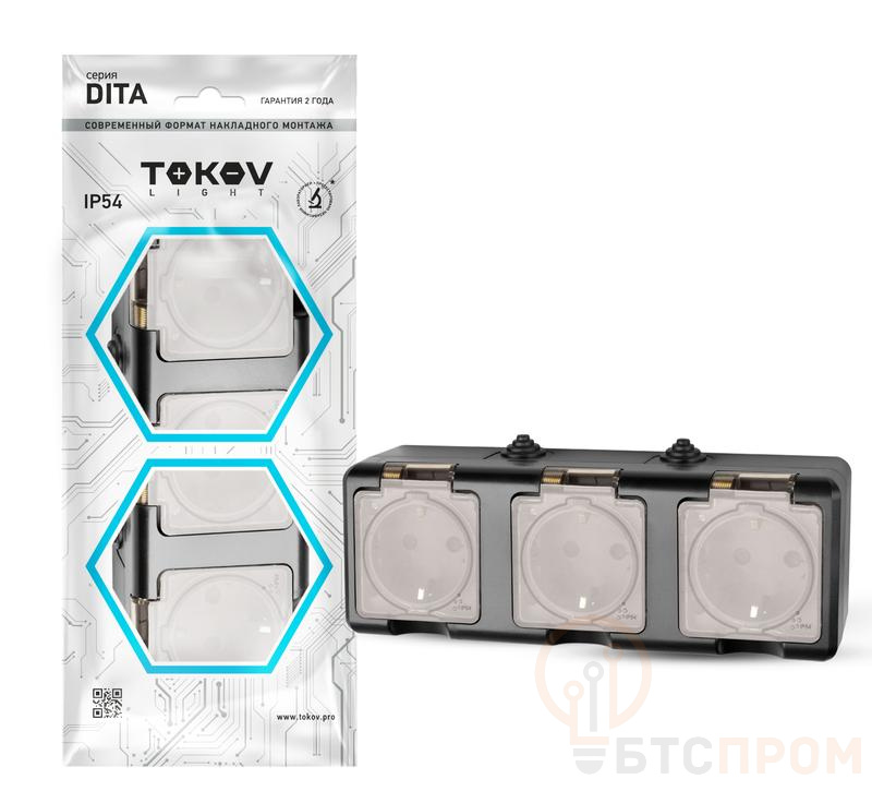 Розетка 3-м ОП Dita 16А IP54 250В с заземл. с прозр. крышкой карбонTOKOV ELECTRIC TKL-DT-R3Z-C14T-IP54