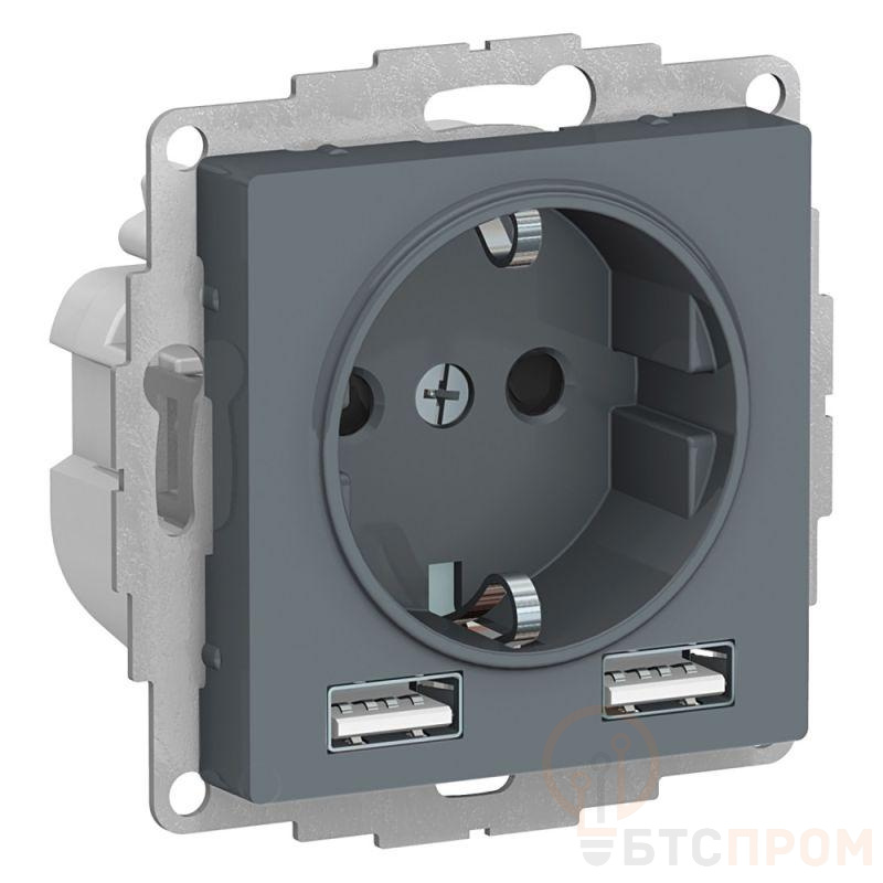Розетка 1-м СП AtlasDesign 16А IP20 с 2-мя заряд. устройствами USB тип A+A 5В/2.4А 2х5В/1.2А механизм грифель SE ATN000730