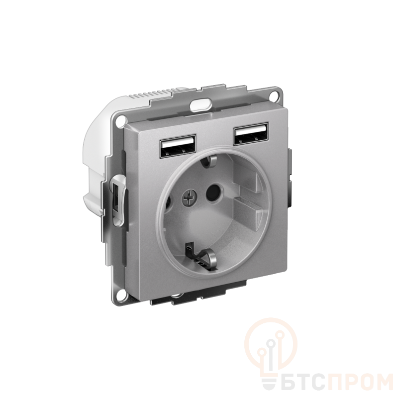 Розетка силовая Systeme Electric (ранее Schneider Electric) серии AtlasDesign 16А (цвет алюминий) с заземлением и шторками с розеткой USB, с друмя разъемами типа А - Лицевые детали из качественного ABS-пластика, устойчивого к царапинам и УФ-излучению. - Заземляющий контакт обеспечивает дополнительную защиту от удара электрическим током. - Шторки обеспечивают дополнительную безопасность в доме, где находятся дети. - Один механизм позволяет как подключить бытовые приборы, так и зарядить мобильные устройства.