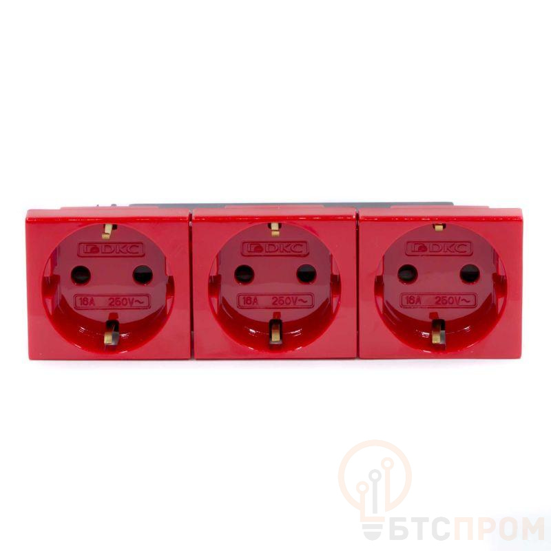 Электрические розетки, штекерные, с заземлением и со шторками, моноблок тройной. Назначение: подключение оргтехники, бытовых приборов и т. п.; экономия времени на подключении кабеля 60 %. Характеристики: в блоке всего 3 клеммы для подключения кабеля – все 3 розетки подключаются одной клеммой; имеется заземление; диаметр отверстий для ввода кабелей - 3 мм (по 2 отверстия на клемму); соответствие ПУЭ, пункт 7.1.49 - имеются автоматические закрывающиеся шторки; номинальный ток – 16 А (на весь блок); номинальное напряжение - 250 B. Кол-во модулей: 6. Установочный размер: 45х150. Цвет: красный