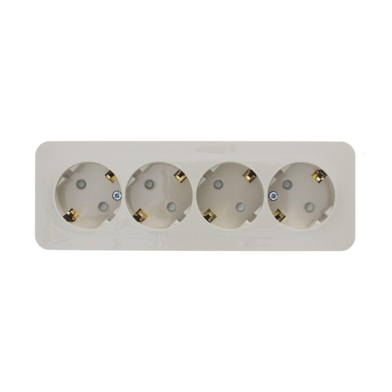Розетка Systeme Electric (ранее Schneider Electric) BLANCA (открытой установки, цвет бежевый) четырёхместная с заземлением и шторками, с изолирующей пластиной подходит для сетей 250 В, на ток 16 А. - Заземляющий контакт обеспечивает дополнительную защиту от удара электрическим током. При наличии заземления электрический потенциал уходит в землю, защищая человека. - Входные отверстия расположены под углом 45 градусов, благодаря чему можно подключить несколько устройств: вилки и адаптеры не будут мешать друг другу. -Корпус изделия выполнен из ABS-пластика.
