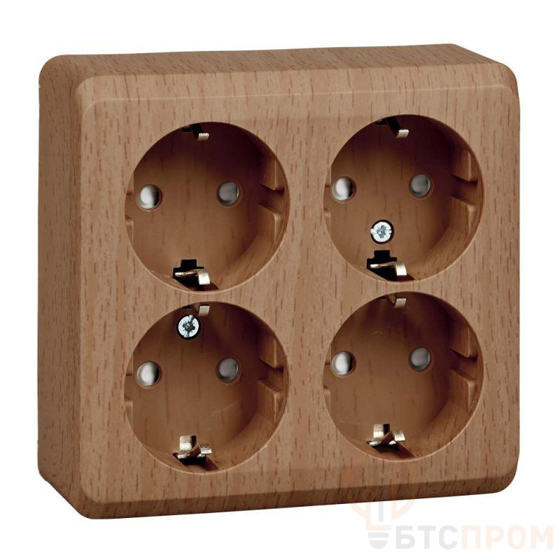 Розетка Systeme Electric (ранее Schneider Electric) ЭТЮД (бук, открытой установки) четырёхместная с заземлением и шторками предназначена для применения в сетях до 250В, на ток до 16А. Четырёхместная розетка позволяет подключить четыре устройства в одном месте. Шторки и заземление обеспечивают дополнительную безопасность при косвенных прикосновениях. Изделия цвета Бук обладают уникальным рисунком, напоминающим древесный сруб. Сделано в России.