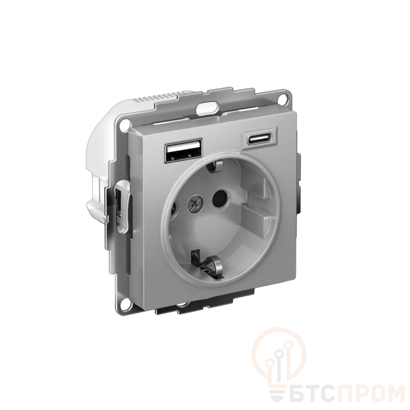 Розетка силовая Systeme Electric (ранее Schneider Electric) серии AtlasDesign 16А (цвет алюминий) с заземлением и шторками с розеткой USB, с двумя разъемами тип А и тип С. Розетка совмещает в себе сразу 3 функции в одном изделии. Удобное и современное решение для дома, офиса и других помещений. - Лицевые детали из качественного ABS-пластика, устойчивого к царапинам и УФ-излучению. - Заземляющий контакт обеспечивает дополнительную защиту от удара электрическим током. - Шторки обеспечивают дополнительную безопасность в доме, где находятся дети. - Одно устройство позволяет как подключить бытовые приборы, так и зарядить мобильные устройства.