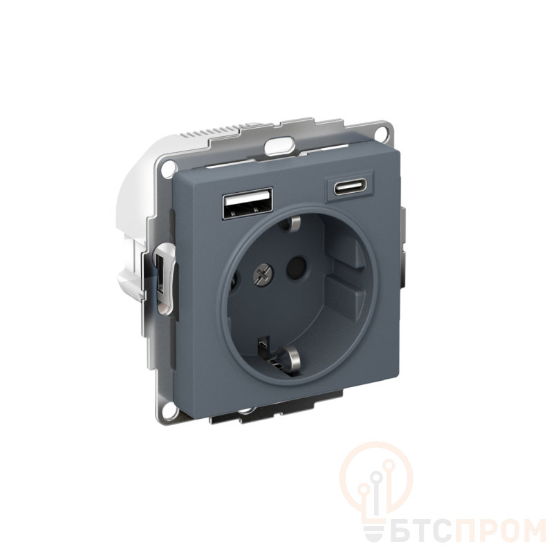 Розетка силовая Systeme Electric (ранее Schneider Electric) серии AtlasDesign 16А (цвет грифель) с заземлением и шторками с розеткой USB, с двумя разъемами тип А и тип С. Розетка совмещает в себе сразу 3 функции в одном изделии. Удобное и современное решение для дома, офиса и других помещений. - Лицевые детали из качественного ABS-пластика, устойчивого к царапинам и УФ-излучению. - Заземляющий контакт обеспечивает дополнительную защиту от удара электрическим током. - Шторки обеспечивают дополнительную безопасность в доме, где находятся дети. - Одно устройство позволяет как подключить бытовые приборы, так и зарядить мобильные устройства.