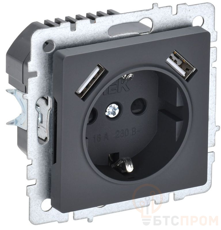 Розетка BRITE РЮш10-1-БрГ 16А с USB A+A 2.1А с заземл. защ. шторки механизм графит IEK BR-R14-16-U21-D21-K53
