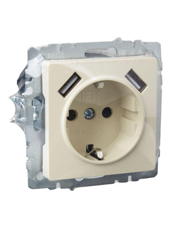 Розетка BRITE РЮш10-1-БрКр 16А с USB A+A 2.1А с заземл. защ. шторки механизм беж. IEK BR-R14-16-U21-D21-K10