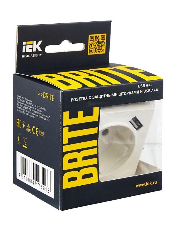 Розетка BRITE РЮш10-2-БрБ 16А с USB A+A 3.1А с заземл. защ. шторки механизм бел. IEK BR-R14-16-U21-D31-K01