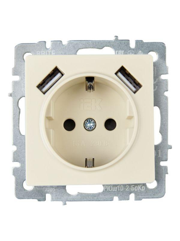 Розетка BRITE РЮш10-2-БрКр 16А с USB A+A 3.1А с заземл. защ. шторки механизм беж. IEK BR-R14-16-U21-D31-K10
