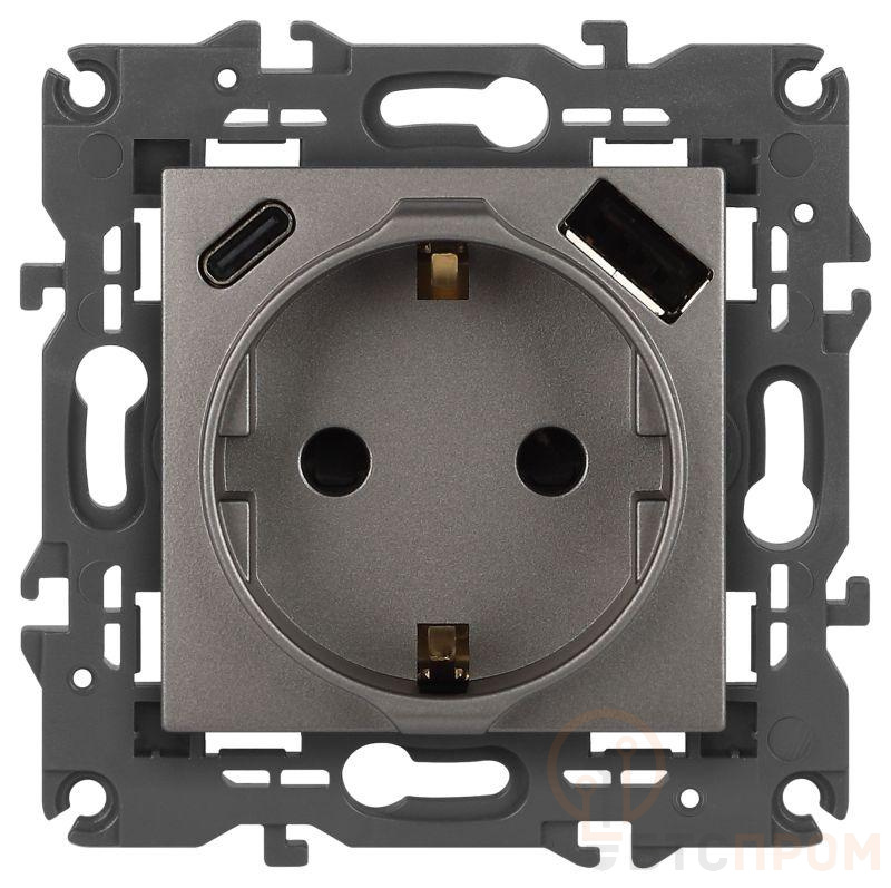 Розетка с USB A+C серии Эра Elegance 14-4108-16 цвет титан. Номинальные характеристики: розетка силовая – 16А 250В. Розетка USB type A – 3A 5В. Розетка USB type C – 3A 5В. Рамки приобретаются отдельно