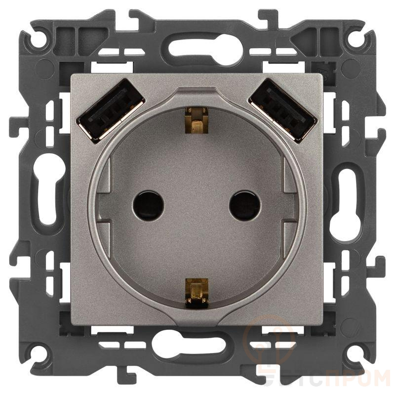 Розетка с USB серии Эра Elegance цвет титан 14-4109-16. Номинальные характеристики силовой розетки 16А 250В, разъемов USB 3А 5В. Оснащена автоматическими клеммами для надёжной фиксации жил кабеля в механизме.