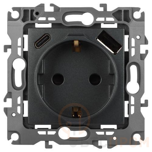Устройство оснащено двумя классическими еврогнездами (2P+E) с защитными шторками для безопасного использования, рассчитанными на ток 16А и напряжение 250В. Главной особенностью является наличие двух портов USB: стандартного Type-A и современного Type-C с суммарным током до 3А и напряжением 5В, что позволяет быстро заряжать смартфоны, планшеты и другие электронные устройства без использования родных блоков питания.