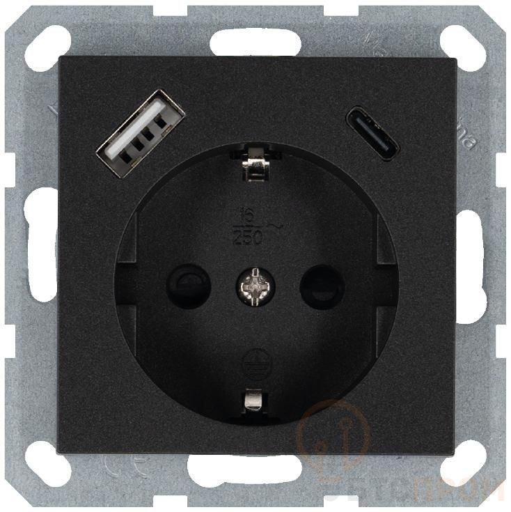 Розетка Shuko 16А с заземл. защ. шторки с 2-мя заряд. устройствами USB тип A+C 25Вт механизм антрацит Jasmart G5501USB-25B