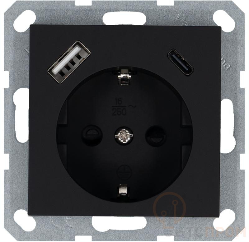 Розетка Shuko 16А с заземл. защ. шторки с 2-мя заряд. устройствами USB тип A+C 25Вт механизм черн. матов. soft touch Jasmart G5501USB-25PB