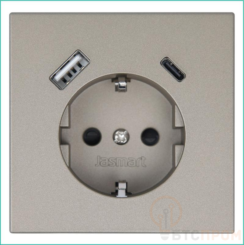 Розетка СП FD Shuko 16А с заземл. защ. шторки с 2-мя заряд. устр. USB тип A+C 25Вт механизм бронза Jasmart FD5501USB-25BR