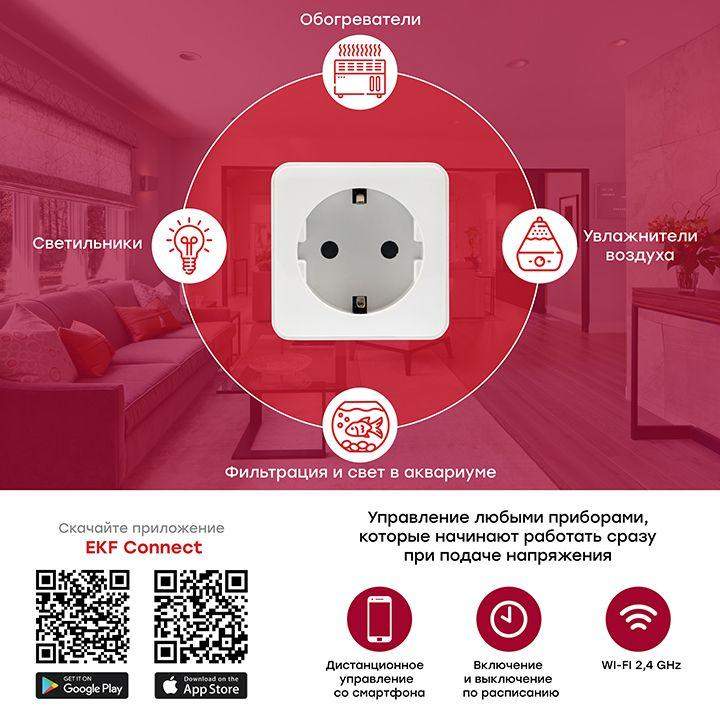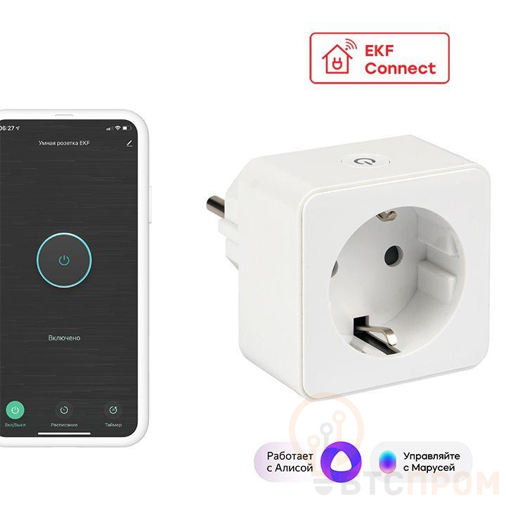 Умная розетка EKF Connect поможет сделать обычные приборы умными. При помощи приложения для EKF Connect Home Android и iOS, а также при помощи голосовых помощников Алиса от Яндекса, Маруся от VK и Салют от Сбера можно управлять светильниками, вентиляторами, обогревателями, увлажнителями и любыми другими приборами, которые начинают работать сразу же при подаче напряжения.