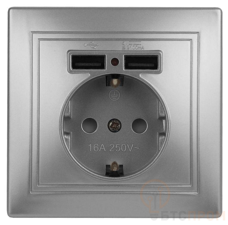 Розетка с заземлением 2P+E Schuko со шторками, 16А-250В + 2хUSB 5В-2,1А, IP20, СУ, алюминий Intro Plano 1-410-03