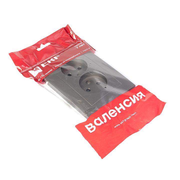 Лицевая панель двухместной розетки EKF серии Валенсия устанавливается на соответствующий механизм. Панель выполнена из поликарбоната, устойчивого к ультрафиолетовому излучению.