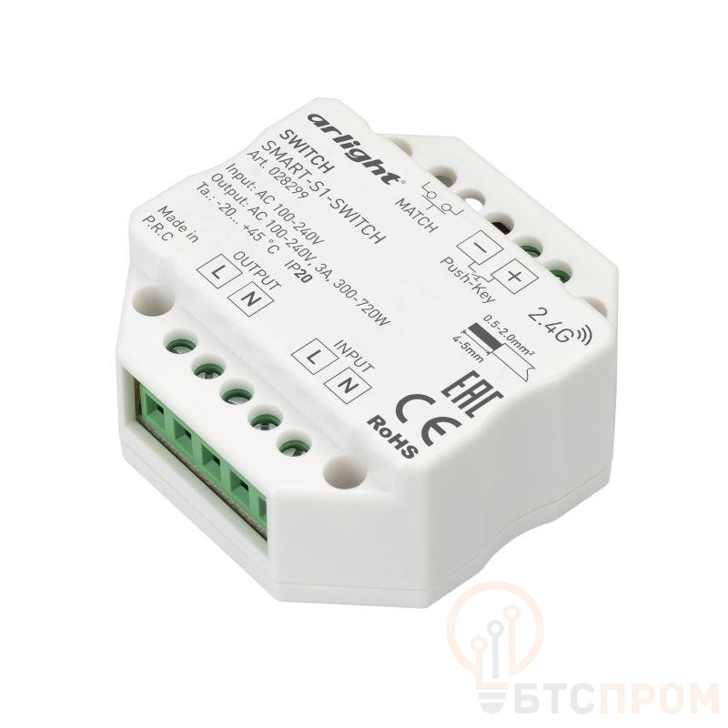 Выключатель с RF управлением. Управляется пультами и панелями серии SMART. Питание 100-240VAC, макс.ток 3А. Габариты: 52x52x26 мм.
