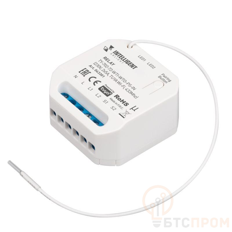 Модуль релейный TY-702-72-WTI-WTO-PS-IN 230В 2х5А TUYA Wi-Fi 433Mhz IP20 пластик INTELLIGENT ARLIGHT 043301