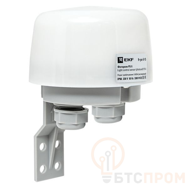 Фотореле PS-5 применяется для управления освещением или другой нагрузкой в зависимости от уровня освещенности. Обычно фотореле применяется в системах управления уличным освещением и включает/выключает нагрузку в момент захода/восхода солнца. К фотореле допускается прямое подключение нагрузки с током не более 15А. Нагрузка большей мощности может быть подключена при помощи контактора. Порог срабатывания по освещенности настраивается в диапазоне 5-50 лк. Фотореле имеет степень защиты IP66, что позволяет устанавливать его в условиях сильного воздействия пыли и влаги.