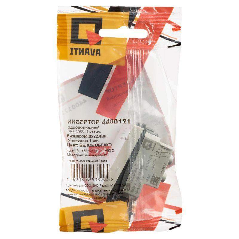 Инвертор модульный. Предназначен для монтажа в систему пластиковых коробов "In-liner Front" и систему организации рабочих мест "Sotto" при помощи рамок-суппортов и каркасов "Avanti" (код 4400912 и т.д.). Используется для включения/выключения освещения с трех и более точек. Диаметр отверстий для ввода кабелей – 3 мм (по 2 отверстия на одну клемму). Винтовые зажимы. Шаблон для зачистки кабеля – 11 мм. Номинальный ток – 16 A. Номинальное напряжение – 230 В. Фиксация в подрозеточные коробки при помощи каркаса с лапками (код 4400802) и саморезов. 1 модуль. Цвет: "Белое облако". Производитель оставляет за собой право вносить во внешний вид изделия изменения, которые не влияют на его функционал, безопасность и надежность.