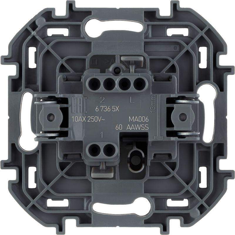 Переключатель одноклавишный скрытого монтажа Inspiria, цвет "Антрацит", номинальный ток 10АХ, напряжение ~250В, безвинтовые зажимы. Устанавливается в жилых и общественных помещениях для управления приборами освещения, вентиляции и т.д. Предназначен для управления одной нагрузкой с одного, двух или более мест (совместно с перекрёстными переключателями).
