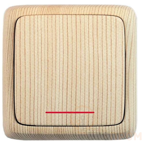 Ключевая особенность — наличие индикатора, который позволяет легко найти выключатель в темноте. Устройство оснащено изолирующей пластиной для безопасного монтажа. Эстетичная рамка выполнена в цвете «сосна» и гармонично впишется в интерьеры, оформленные в классическом или деревенском стиле, добавляя им уюта и натуральности.