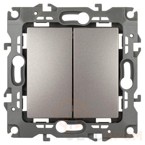Выключатель двухклавишный проходной (переключатель) серии Эра 12 скрытой установки механизм цвет титан 12-1106-16. Номинальные характеристики 10А 250В . Сделан из поликарбоната, оснащён автоматическими клеммами для быстрой и надёжной фиксации жил кабеля в механизме. Парные клеммы обеспечивают соединение шлейфом. Монтаж в подрозетник производится и на лапки, и на винты. Рамки приобретаются отдельно.