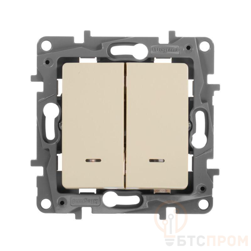 Переключатель с подсветкой двухклавишный ETIKA для скрытого монтажа, номинальный ток 10 А. Предназначен для управления двумя нагрузками с одного или с двух мест.