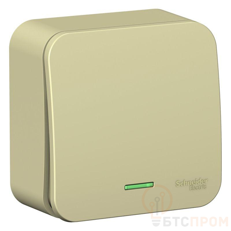 Переключатель одноклавишный Systeme Electric (ранее Schneider Electric) BLANCA (открытой установки, цвет бежевый) с изолирующей пластиковой пластиной и подсветкой предназначен для сетей до 250 В, на ток до 10 А. - Благодаря светодиодной подсветке зеленого цвета изделие легко найти в темноте. - Переключатель позволяет управлять одним источником света с двух точек. -Корпус изделия выполнен из ABS-пластика.