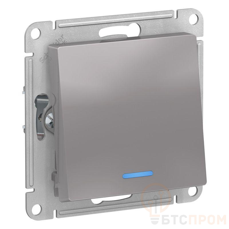 Механизм переключателя 1-клавишного с подсветкой Systeme Electric (ранее Schneider Electric) серии AtlasDesign в цвете алюминий подходит для сетей 250 В, на ток 10 А. - Благодаря светодиодной подсветке синего цвета изделие легко найти в темноте. - Переключатель позволяют управлять одним источником света с двух точек. - Лицевые детали из качественного ABS-пластика, устойчивого к царапинам и УФ-излучению.